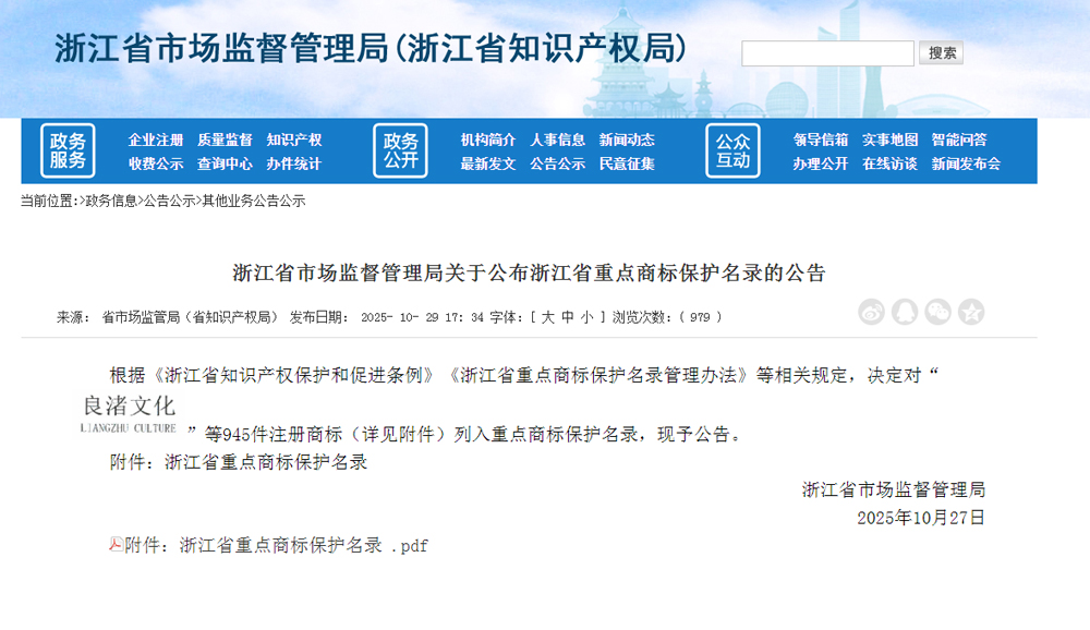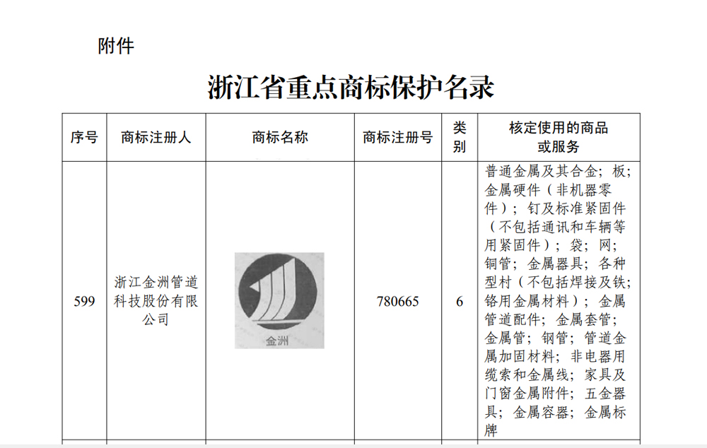 近日,浙江省市场监督管理局公布《浙江省重点商标保护名录》,全省共有945件注册商标入选,“金洲”商标位列其中。此次入选标志着金洲管道在品牌建设、知识产权保护方面再上新台阶,为企业品牌化发展注入更强劲动力和更有效保障。